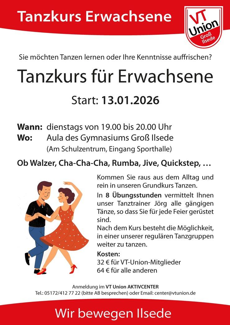 Am 13. Januar 2026 beginnt bei VT Union ein Tanzkurs für Erwachsene (Paare). In 8 Übungseinheiten a´60 Minuten werden die Grundschritte in mehreren Standard- und Lateintänzen (z.B. Langsamer Walzer, Quickstep, Tango, Rumba, Cha-Cha-Cha, Jive) erlernt. Sehr gerne kann nach dem Kurs eine Integration in unsere bestehenden Tanzgruppen erfolgen.