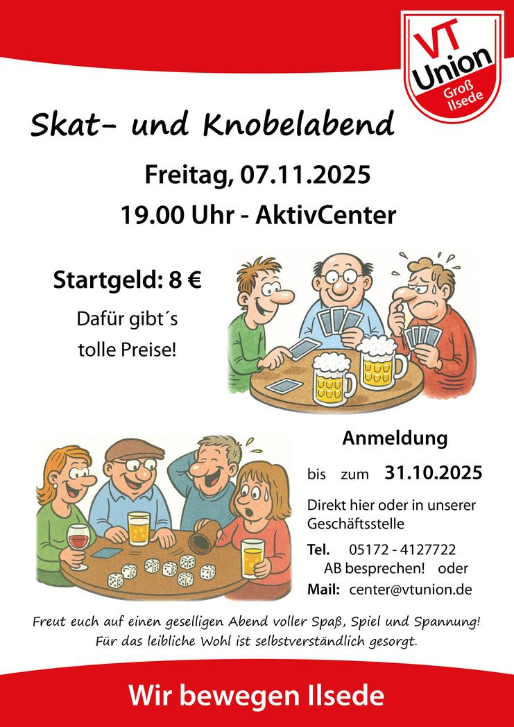 Am Freitag, den 07.11.2025 findet der diesjährige Skat- und Knobelabend statt. Beginnen wollen wir um 19.00 Uhr im AktivCenter (Kursraum OG).