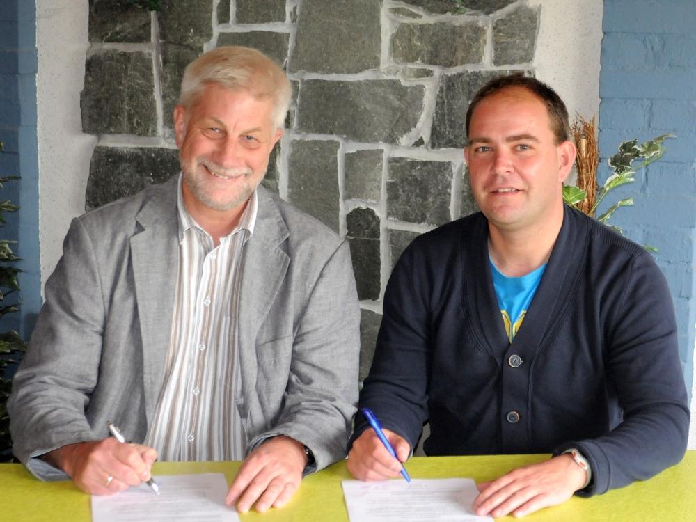 Die Vereinsvorsitzenden Edgar Janßen (VT Union) und Matthias Krökel (TV) "besiegeln" mit ihren Unterschriften den von den Vorständen beider Vereine beschlossenen Kooperationsvertrag.